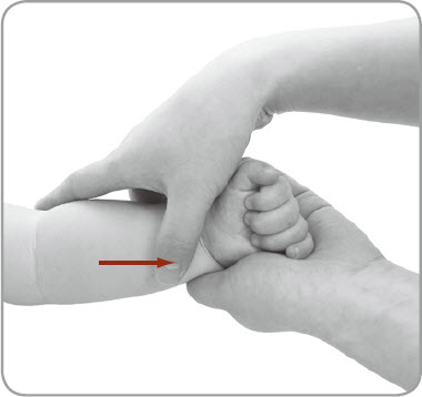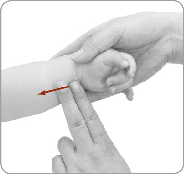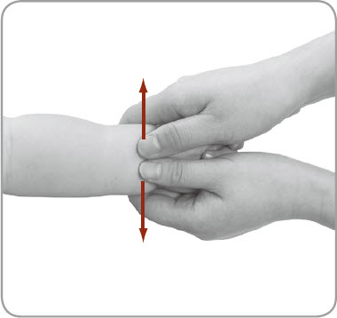 按摩者一手握住小儿的手,用另一手的食、中二指指腹沿小儿前臂内侧正中,自腕横纹推至肘横纹即大陵至洪池50~100次。