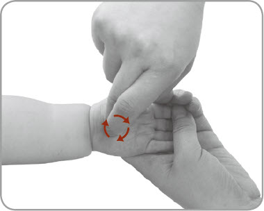 按摩者以两拇指自小儿掌横纹中总筋处向两旁分推腕横纹50~100次。