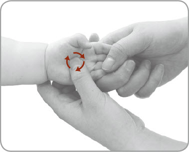 按摩者一手握住小儿的手,使其掌心向上,以另一手拇指端揉运小儿内劳宫穴(屈指时中指、无名二指所指处中间)50~100次。