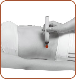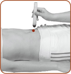 施灸方法:此穴需两人配合施灸。宜采用回旋灸的方法。被施灸者平卧,施灸者站于一旁,手执点燃的艾条,对准施灸部位,距离皮肤1.5~3厘米,左右方向平行往复或反复旋转施灸,以被施灸者感到施灸处温热、舒适为度。