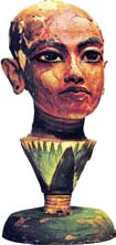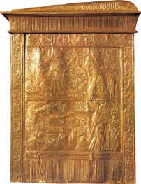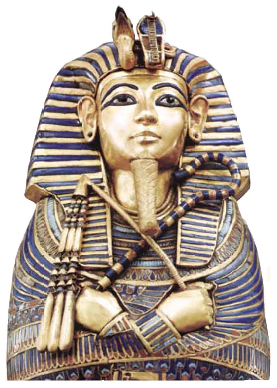 人们没有顾忌这个勇敢的形象,而是毫不犹豫地移去棺盖。是的,卡特的考古已经进行到最后一个关口,哪怕死神就在眼前,他也要完成这最后的揭幕。棺木上的包布被一层层揭开,一具人形的木质金像棺木出现了,上面覆盖着图坦卡蒙的头像,年轻法老眼睛是黑曜石的,眉和眼睑是青石玻璃的,他目光炯炯而威严,似乎在嘲弄每一个惊扰了他恬静睡眠的人。这就是日后在所有的埃及文物展览中最著名的头像。