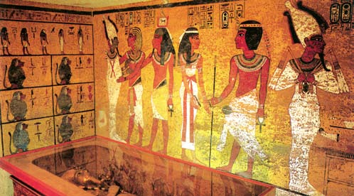 墓室的第三道门很快就被打开了,一座绘满五彩斑斓壁画的木乃伊墓室出现在人们眼前。壁画上,古埃及人在用自己的方式描述着他们深信不疑的故事:高贵的图坦卡蒙法老死后与地狱诸神——奥西里斯、阿努比斯、伊西斯来往的情景,图坦卡蒙像他自己希望的那样获得了重生。