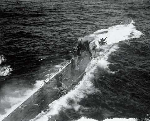 1939年10月14日,德国海军上尉高特·普里恩指挥着他的U-47潜艇在夜色的掩护下潜入了斯卡帕湾军港,用三枚鱼雷击沉了排水量3.3万吨的英国“皇家橡树”号战列舰,造成至少800名英国水兵在这次袭击中死亡。照片中的U-47潜艇正在大西洋游弋。