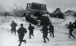 手持莫辛-纳甘步枪和波波沙冲锋枪的苏军士兵,在坦克的掩护下对德军发动反冲击。