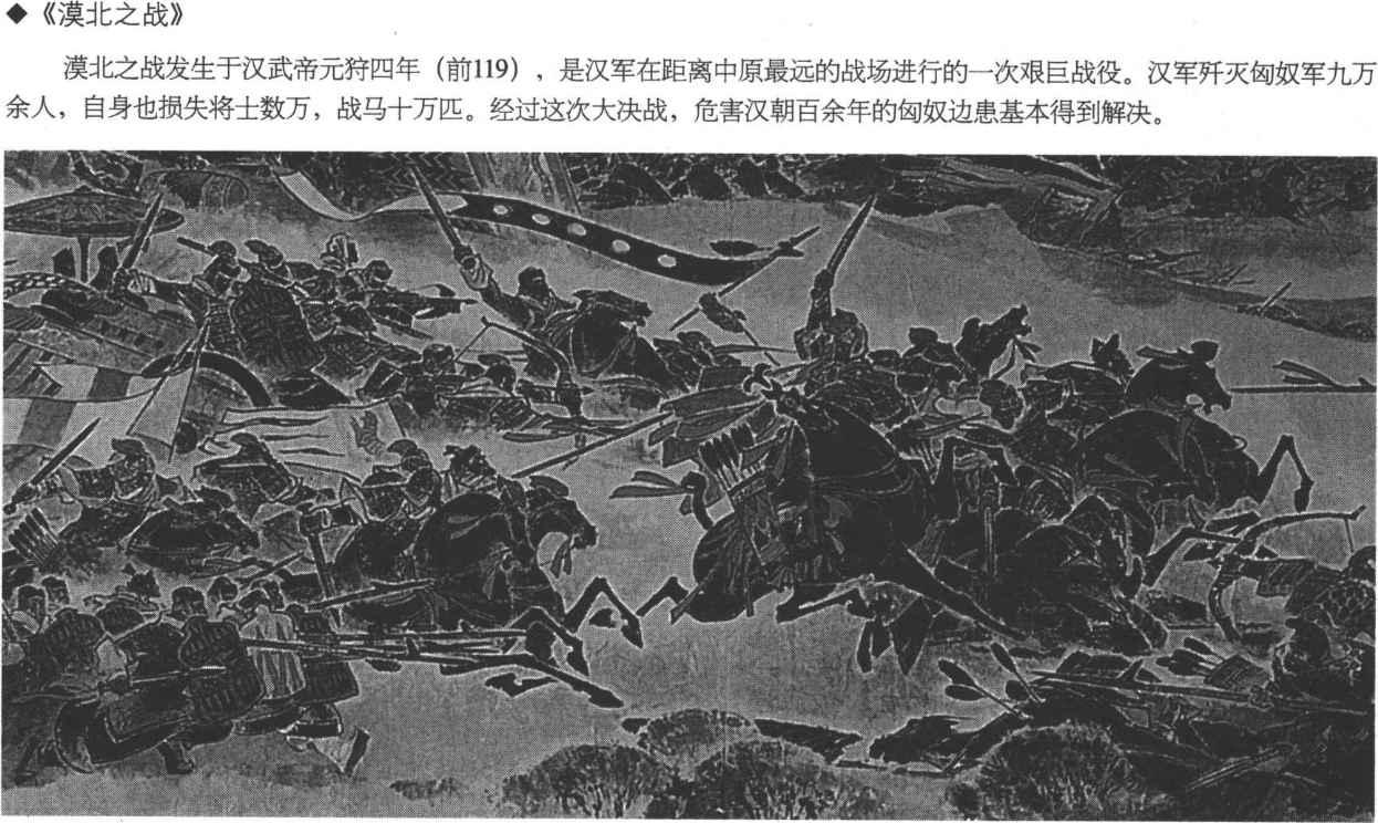 元狩四年(前119),武帝策动漠北之战,命卫青、霍去病各率领五万骑兵,分道出击匈奴。霍去病出代郡,深入沙漠两千余里,大败匈奴左贤王,斩获七万余人,获封骠骑大将军,得食邑五千八百户。霍去病一生战功显赫,他带兵注重实际,不死守兵法。武帝曾想教他学孙吴兵法,他却说:“打仗要看具体情形来制订作战方案,不必学习古代的兵法。”霍去病为人沉默寡言,有谋略,敢作敢为,却不体恤下属。他率军出征时,武帝遣太官为他带了数十车生活用品。待到霍去病班师回朝的时候,不管部队里是不是有士兵挨饿,他都会把剩余的米和肉都丢掉。在塞外作战的时候,士兵们吃不饱饭,有的士兵都饿得爬不起来了,霍去病却还要踢球玩乐。武帝曾替他修建了一座豪华的宅第,让他去看看。霍去病却以“匈奴未灭,何以家为”八个字拒绝了武帝的美意,成为历代臣子的典范。