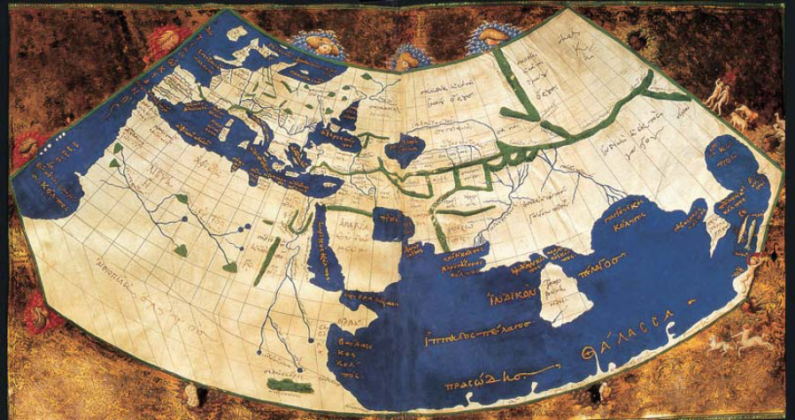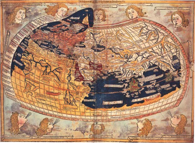 《地理学指南》中的世界地图 这是托勒密《地理学指南》早期版本中的插图,图中绘有经纬度和周围以人的形象出现的风。