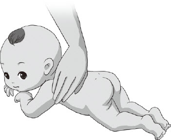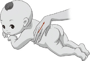 Step 2:换成俯卧位,用手掌横擦宝宝的肩膀、背部、腰部及骶部,时间不宜长,以皮肤略显发红、温热为度。