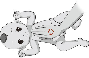 Step 1:手指并拢,掌心贴在宝宝肚脐上,以肚脐为中心,顺时针抚摩5~10分钟,对腹部稍稍施压。