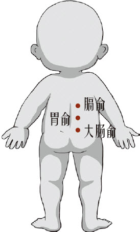 Step 3:取俯卧位,用拇指揉按膈俞穴、胃俞穴、大肠俞穴,每处1分钟。