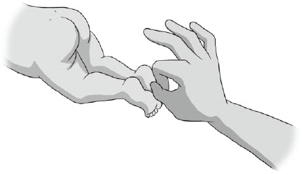 Step 5:如果打嗝不很严重,可以用弹脚心法止嗝。即在宝宝打嗝时候,用手指轻轻地弹宝宝的脚心,能够立即止呃逆。