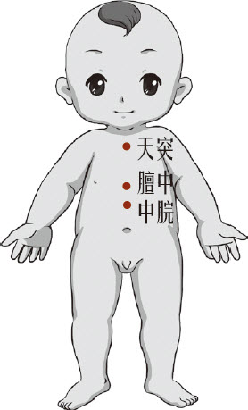 Step 2:拍打完毕,轻轻平放在床上,用拇指指腹点揉天突穴、膻中穴各1分钟,然后用掌心放在中脘穴,顺时针方向抚摩5分钟,再用手指从中脘穴向外分推30~50次。