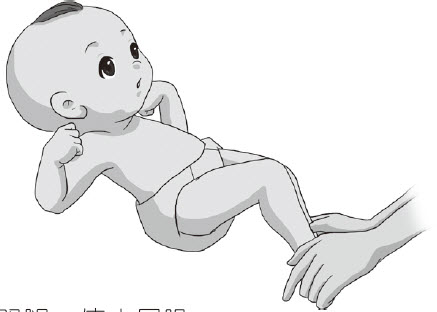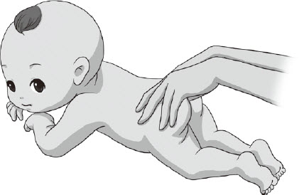 Step 2:保持姿势不动,请另外一个人站在宝宝头部方向,双手托起宝宝的臀部,轻轻地抚摩,并用手指擦揉。
