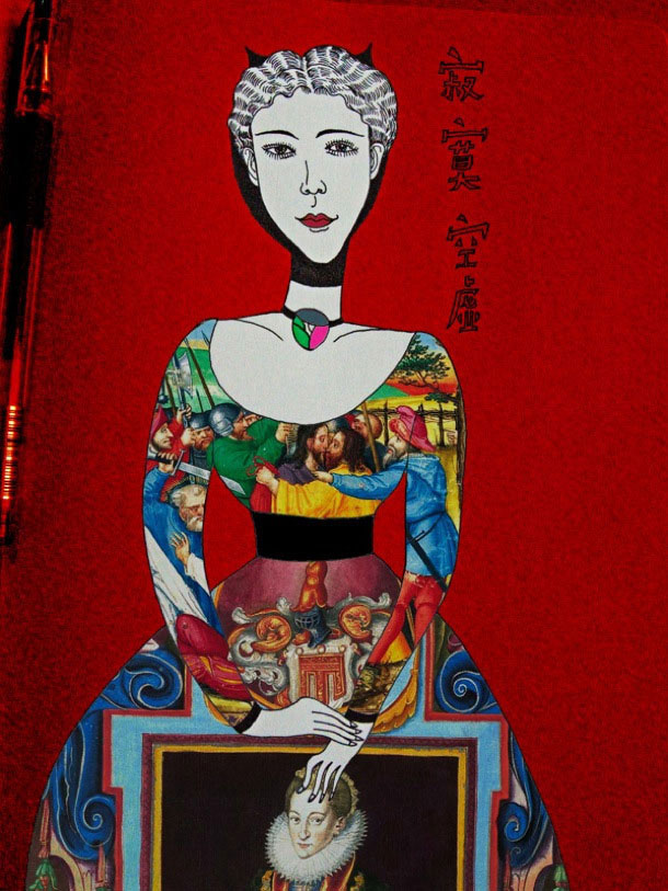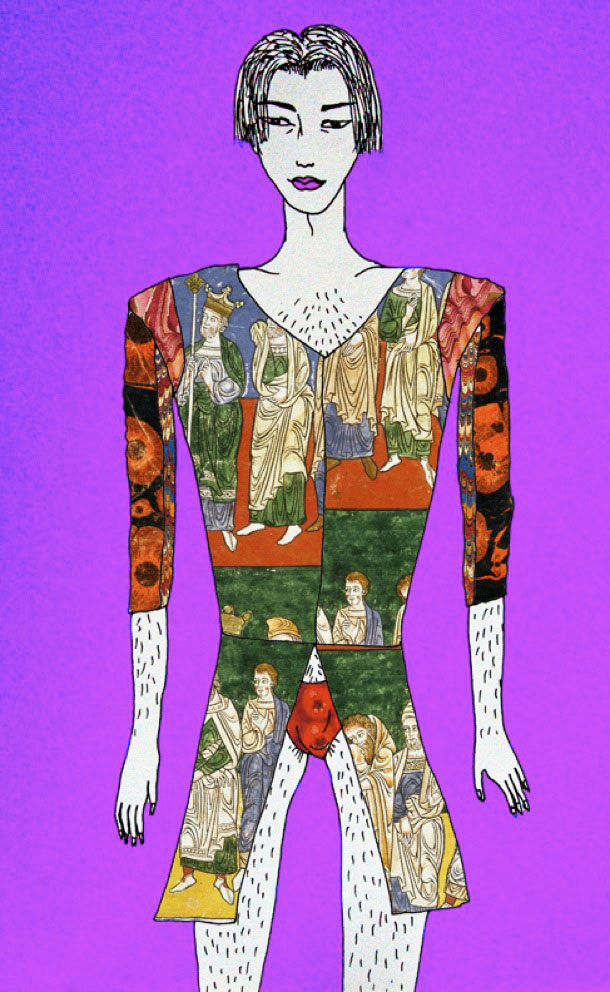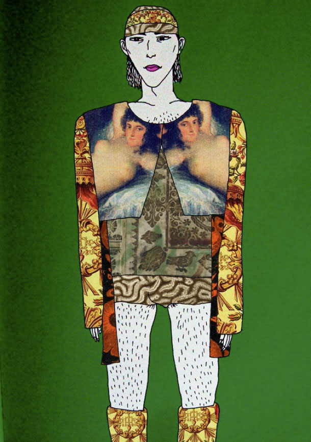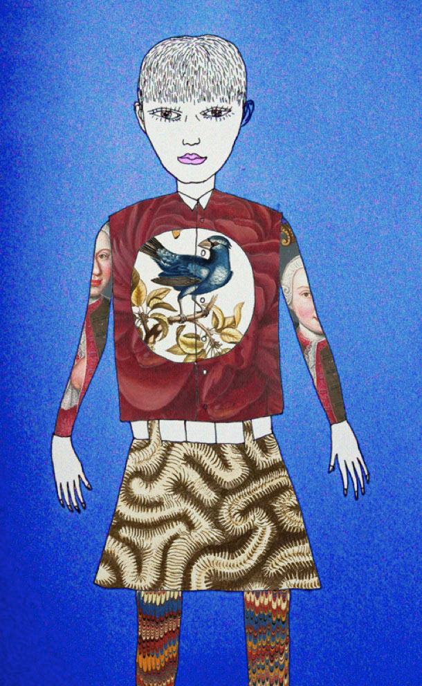 同样作为古着达人的他,也将这份热情积极投射在他的插画世界里。对于那些来自18-19世纪的古典绘画及纹样率性拼贴,让画中的人物古着味肆意。