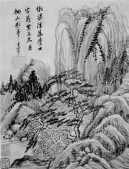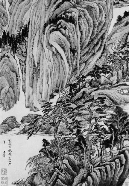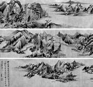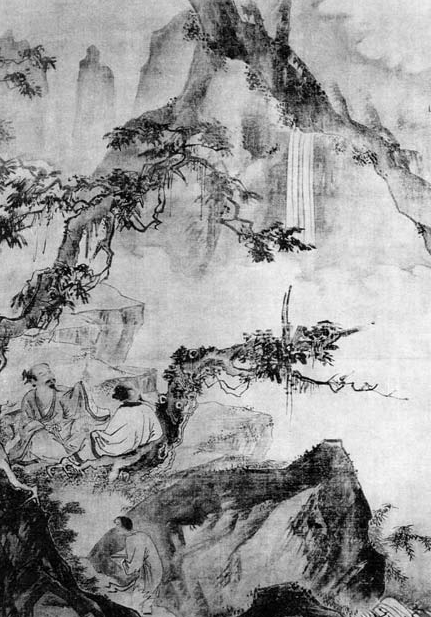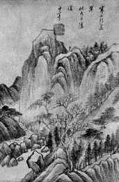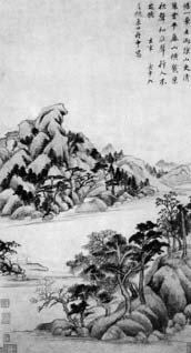 “山水画至唐始变,盖有两宗:李思训,王维是也。李之传为宋王诜、郭熙、张择端、赵伯驹、伯骕以及李唐、刘松年、马远、夏圭皆李派。王之传为荆浩、关同、李成、李公麟、范宽、董源、巨然以及燕肃、赵令穰、元四大家皆王派。李派板细无士气,王派虚和萧散;此又慧能之禅,非神秀所及也。至郑虔、卢鸿一、张志和、郭忠恕、大小米、马和之、高克恭、倪瓒辈,又如方外不食烟火人,另具一骨相者。”