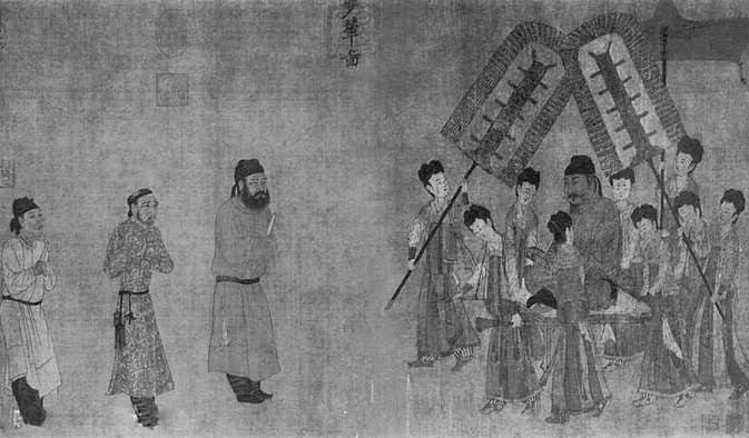 《步辇图》是以贞观十五年(641年)吐蕃首领松赞干布与文成公主联姻的历史事件为题材,描绘唐太宗接见来迎娶文成公主的吐蕃使臣禄东赞的情景。