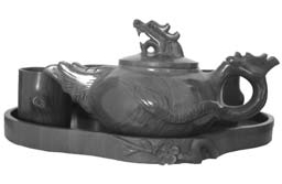 木鱼石茶具是指用整块木鱼石作出来的茶具,主要包括茶壶、酒壶、竹节杯、茶叶筒等。木鱼石中含有铀及稀土元素,因此茶具的防腐和通透性好,用其泡茶即便是在酷暑季节,五天内茶水仍可饮用不会变质。