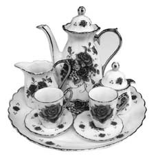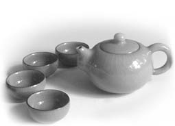 瓷器茶具是使用时间最长、范围最广的茶具。瓷器茶具可分为白瓷茶具、青瓷茶具、黑瓷茶具和彩瓷茶具等。其中,白瓷以景德镇的瓷器最为著名,其他如湖南醴陵、河北唐山、安徽祁门的茶具也各具特色。青瓷的主要产地在浙江,最流行的一种叫“鸡头流子”的有嘴茶壶。黑瓷兔毫茶盏,风格独特,古朴雅致,而且瓷质厚重,保温性能较好,为斗茶行家所珍爱。彩色茶具的品种花色很多,其中尤以青花瓷茶具最引人注目。青花瓷器的特点是:花纹蓝白相映成趣,有赏心悦目之感;色彩淡雅幽菁可人,有华而不艳之力。加之彩料之上涂釉,显得滋润明亮,更平添了青花茶具的魅力。