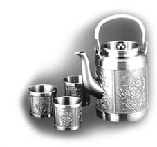 金属茶具是用金、银、铜、锡等金属材料制作的茶具。以锡作为贮茶器具材料有较大的优越性。锡罐多制成小口长颈,盖为筒状,比较密封,因此对防潮、防氧化、防光、防异味都有较好的效果。但因其造价昂贵,一般老百姓无法使用。唐代茶书《十六汤品》中说:“以金银为汤器,为富贵者具焉。”