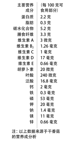 香菇中含有维生素D原,它经紫外线照射会转化为维生素D,被人体吸收,对于增强人体抗病能力起着重要作用。香菇含有抗病毒活性的双联核糖核酸类,还含有一种多糖,能提高机体对病毒的抵抗力,具有明显的抗肿瘤活性和调节机体免疫功能等作用。
