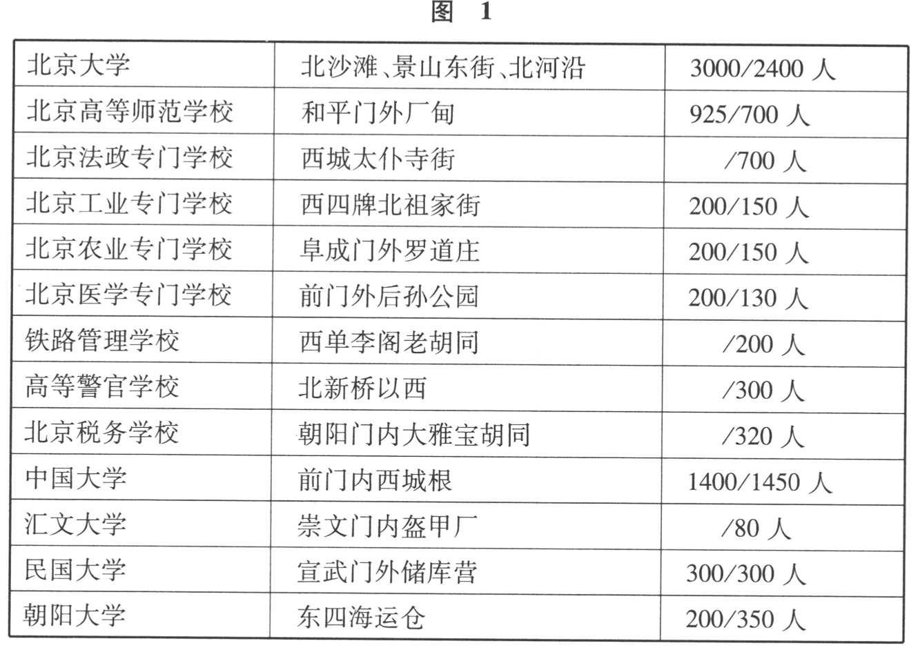 以天安门红墙为背景举行集会,学生自然只能来自“东西南”三个方向,而不可能从北边的故宫冲杀出来。看来,记者的用词还是蛮讲究的,比起日后众多“四面八方”之类的概说,报道中之“找不着北”更为准确。可这不能理解为当年北京的专门以上学校均集中在天安门的东西南三个方向。恰恰相反,当天参加游行的13所学校,处在东西长安街以北的就有8所。这13所学校当年的校址以及学生数,现列表如下。表中学生数目有二,均为略数(如“三百余人”以300人计),前者见静观《北京专门以上学校新调查》 [22] ,后者依据1919年5月5日学生所呈《上大总统书》上的签署 [23] 。至于校址,根据各种资料综合而成。