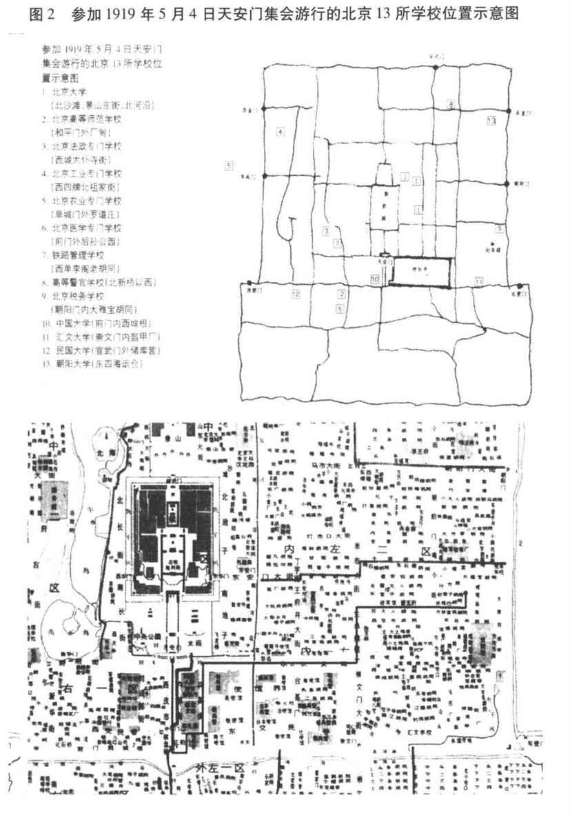 为了让读者对当年天安门前游行学生的“来龙去脉”有感性的了解,这里根据侯仁之先生主编《北京历史地图集》 [24] 中的“民国北京城”(1917年),编制成“参加1919年5月4日天安门集会游行的北京13所学校位置示意图”。北京农业专门学校地处阜成门外,不在原图范围内;民国大学1917年方才正式招生,原图未来得及标上。余者,对照阅读附图,不难“按图索骥”。锁定各校位置,对于今人之想象学生如何走向天安门,相信不无帮助。
