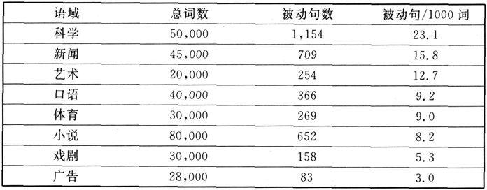 韩礼德也注意到斯伐特维克(Svartvik 1966: vii)对英语语态的研究。斯伐特维克在《论英语动词的语态》一书中确认语言频率计算的意义不是某种微不足道的东西。他本人使用语料库的资料建立英语被动语态分类的标准,即“被动语态量表”。他也计算被动小句和主动小句的比例,在不同语域之间比较被动语态的频率,因此认为有些范式不能降低为偶然性的事例。表5示意他对不同语域的分析(1966: 155)。