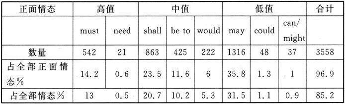 语域不仅仅是题材的不同,还涉及对整个词汇语法的不同选择,以表述意义的细微不同。许多语域并未使用“特殊”的语法(当然个别例子有,如英语新闻的标题,使用一些在其他语域中不使用的结构)。发生变化的是在某一语域中整个选择构造的变化,可能会发生(或不发生)特定结构的组合,其选择范式与其他语域不完全相同,正如韩礼德所说的,“概率是倾斜的。”譬如说,祈使句不太可能出现于新闻报道中,但非常可能出现于菜谱中;过去式非常可能出现于叙事文中,而科学文章更有可能使用现在时态。我在这里再举一份博士论文,论文作者对法律语言进行了研究。所分析的语料是中国和英美的真实的法律文件。表4是作者对英国法案中正面情态动词使用频率的分析: