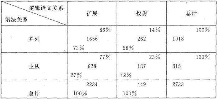 上表说明,当两个系统相交时,比例不动。但从各自维度看则有出入,当“并列x扩展”时从语法关系上为73%,从逻辑语义关系上为86%。