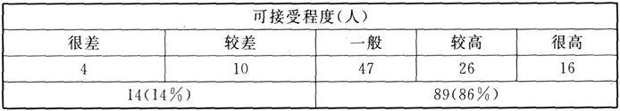虽然追随乔姆斯基的语言学家长期拒绝语言的频率模式作为语言理论的重要性,仍有人自觉不自觉采用了概率理论。我最近参加一所大学的博士生论文答辩。这位年轻学者是研究形式语言学或生成语言学的,在研究汉语部分句式的形式语义分析时,他在使用了不少人造句子后,却制作了问卷调查表,把可接受程度分为“很差,较差,一般,较高,很高”共五个等级,让受试者填充。他对“有的同学每个老师都喜欢”这句话提供了如下的分析表。