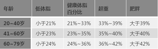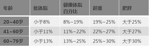从以上数据大家可以看出:无论男女,随着年龄的增加,人体健康体脂百分比有增加的趋势。第二个特点就是,同年龄组男性的健康体脂百分比小于女性。