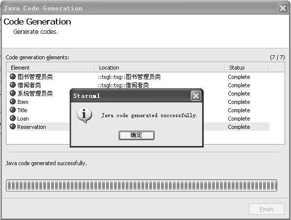 弹出“Java code generated successfully”的提示,说明现在StarUML已将图产生了代码,如图3.27所示,单击“确定”退出提示对话框。
