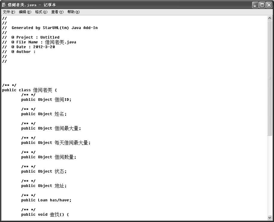 相应的文件中包含了图中对应的属性及操作,即Java中类的变量和方法。借阅者类Java文件如图3.29所示。