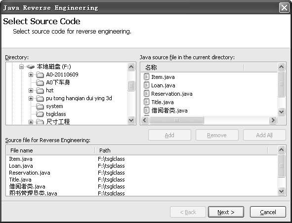 02 在弹出的“select Source Code”对话框中选择Java代码所在的目录,并单击“Add”或“Add All”按钮,将它们包括在逆向工程过程中,如图3.30所示,“”然后单击Next。