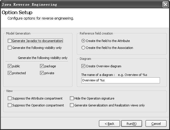 04 在弹出的“Option Setup”对话框中选择默认的“public”、“package”、“protected”和 “ private”。同样,选中默认的单选按钮 “ Create the field to the Attribute”。其他可以不用选中,如图3.32所示。