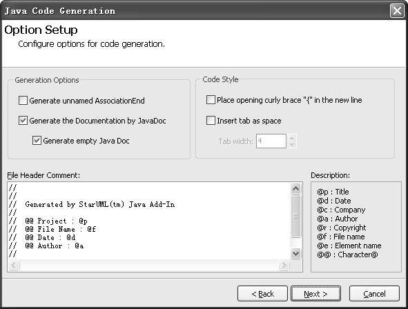 05 在弹出的“Options Setup”对话框中选中“Generate the Documentation by JavaDoc”和“Generate empty Java Doc”复选框,如图3.26所示,单击“Next”。