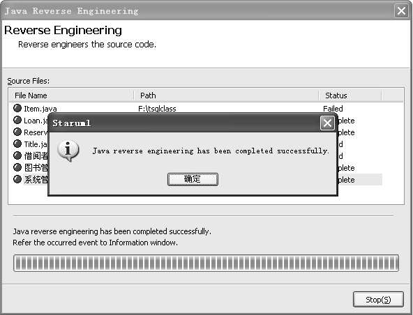 06 弹出“Java reverse engineering has been completed successfully”提示信息,表示逆向工程已成功,如图3.33所示,单击“确定”按钮,在单击“Reverse Engineering”中的“Finish”按钮。