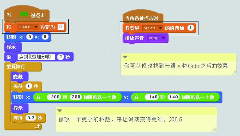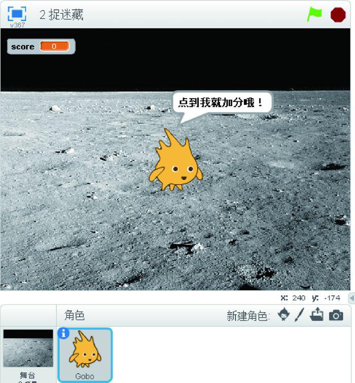 捉迷藏是一个类似于打地鼠的游戏,卡通热舞Gobo会随机地出现在屏幕上,如果在它出现时恰好单击到它,表示分数的变量score就会增加1,如图1.128所示。
