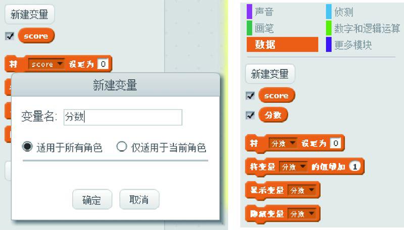 菜单中新建一个变量“分数”,如图1.130所示,随即会出现分数的初始化代码和分数的增加代码。