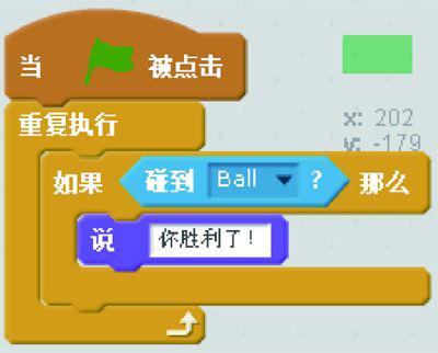 终点代码很简单,当角色Goal碰到Ball的时候,会说“你胜利了”,如图1.133所示。