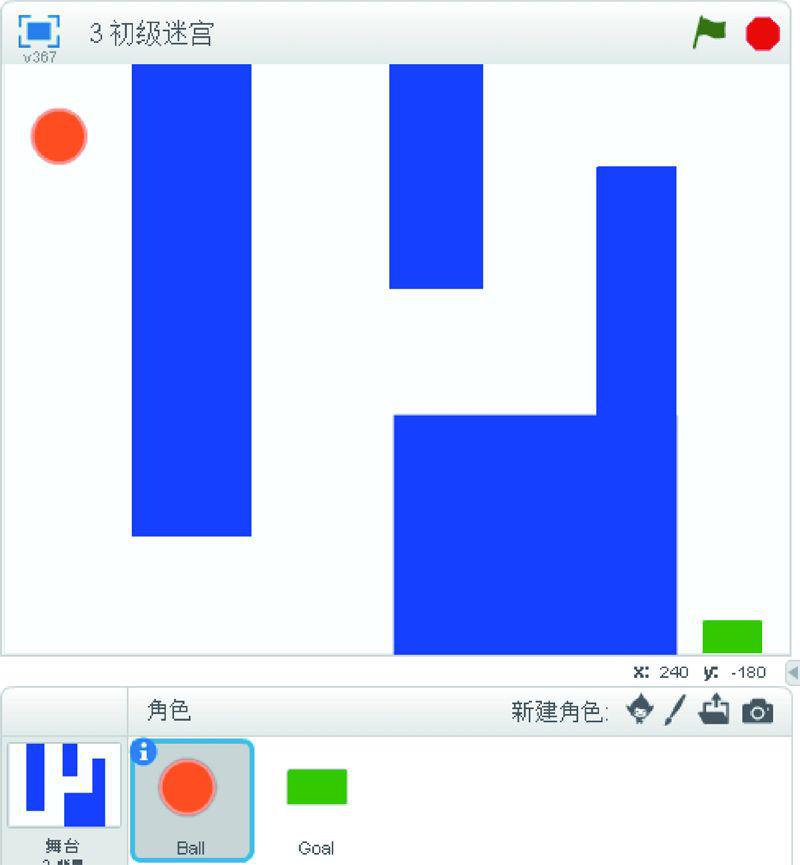 迷宫是一个常见的Scratch游戏,初级迷宫的舞台是一个迷宫,主要角色是一个需要用上下左右键控制的球“Ball”和一个代表终点的角色“Goal”,如图1.131所示。