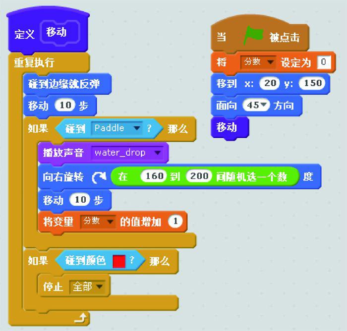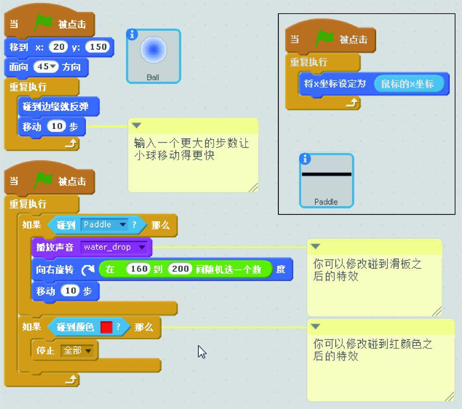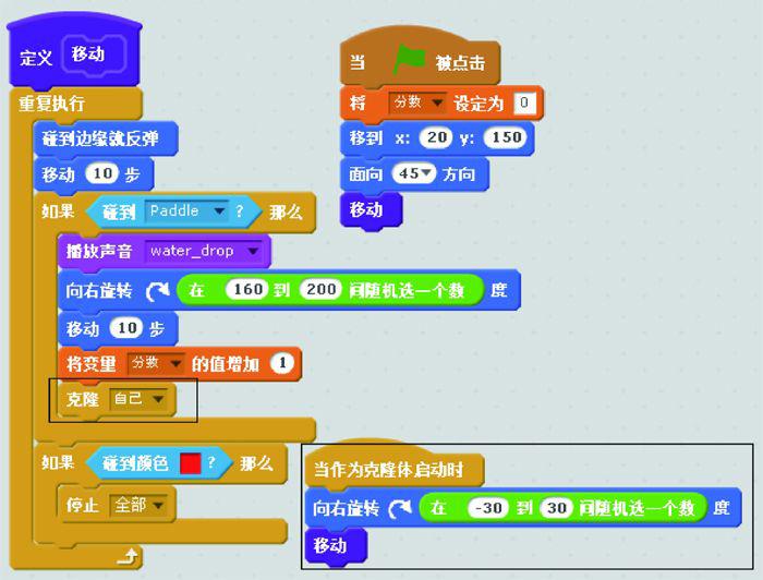 执行一段代码,如图1.137所示。克隆体的出现使得滑板每碰触一次乒乓球,乒乓球就自动地复制出一个新乒乓球,这样随着分数的增加,乒乓球会越来越多,大大地增强了游戏的趣味性。