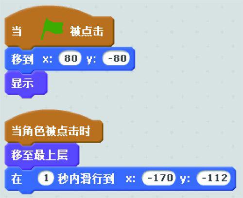 所有角色的代码是类似的,如图1.121所示,单击绿旗初始化一个位置,都是单击该角色的时候将角色放在最上层,然后移动到角色Tera上。