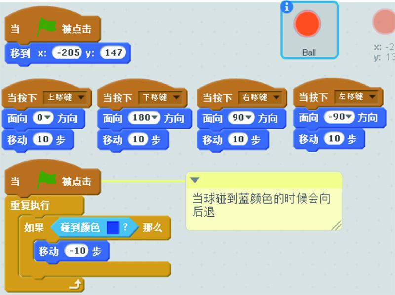 角色Ball的代码包括初始化、移动和碰到墙壁后退3段指令,如图1.132所示,其中