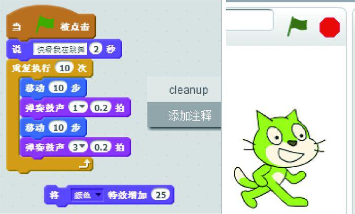 接下来将外观菜单中的“颜色特效增加25”拖动到舞台上并双击,看看小猫的颜色发生了怎样的变化,如图1.16所示。如果期望代码排列得更整齐,可以在空白处右击,在弹出的快捷菜单中选择cleanup命令,意思是整理,把代码摆放整齐。