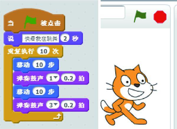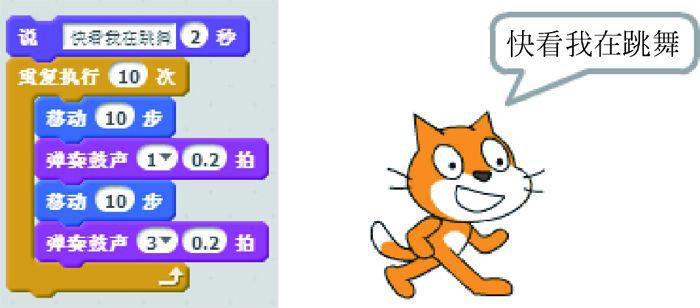 双击右侧的代码,可以看到小猫一边走一边跳舞的场景。