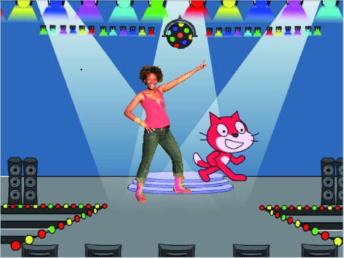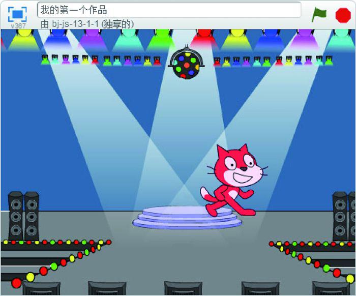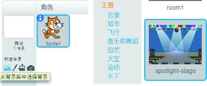 这样小猫除了自己能够跳舞之外,还能随着不同控制改变颜色。既然小猫在跳舞,就一定要有一个背景舞台才好,如图1.18所示,在背景库中选择一个舞台。