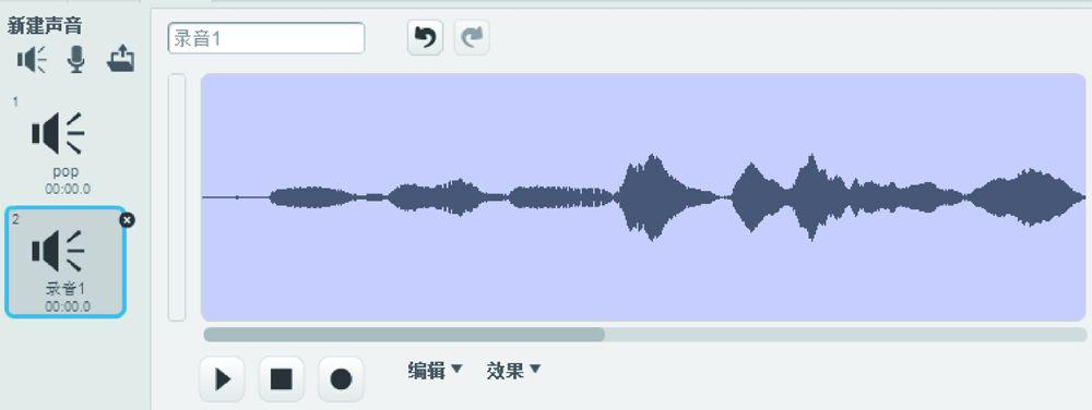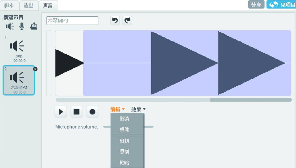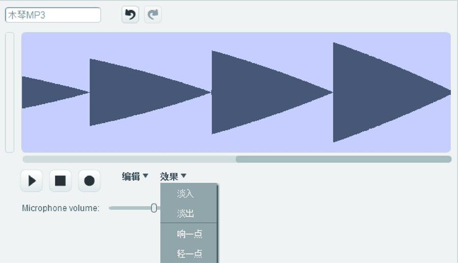 此外,也可以选择上传一段本地的声音。在Scratch 2.0中会显示出本地音乐的波形,与Scratch 1.4相比添加了对MP3格式文件的支持,如图1.27所示。选择多余的声音文件后,可以将其删除,在线编辑音乐的长度。