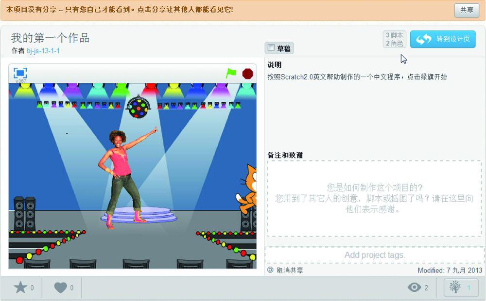 ,就看到了如图1.31所示的作品,单击右上角的“共享”按钮,可以让其他人看到作品,也就是正式发布。其中右侧“说明”区域用来告诉别人这个软件如何使用,下面的“备注和致谢”用于感谢曾经复制过代码的用户。最下面的虚线框可以添加作品标签,网站的访问者可以通过搜索标签关键词来访问作品。