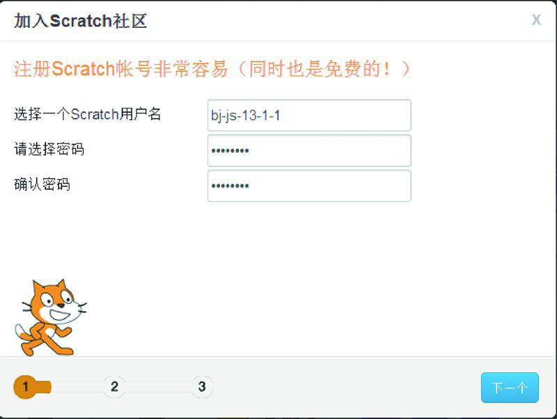 如图1.8所示,填写用户名和密码,这里可以自己填写用户名,但如果是一个小组或者一个学校注册,还期望能够通过用户名找到该同学,比如图1.8所示的用户名中,bj表示北京,js表示景山学校,13-1-1表示2013年入学的初一(1)班的学号为1号的同学,这样方便老师统计学生的情况。
