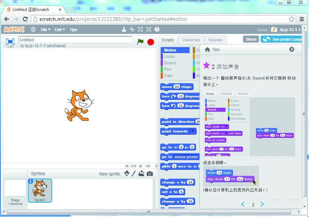 图1.13是按照教程将中间区域的代码拖动到右侧编程区域的一个过程,重复执行10次指令将内部的运动和发声模块连接起来,在连接的过程中,可以看到即将连接成功时会出现一个白色的框提示已经连接好。